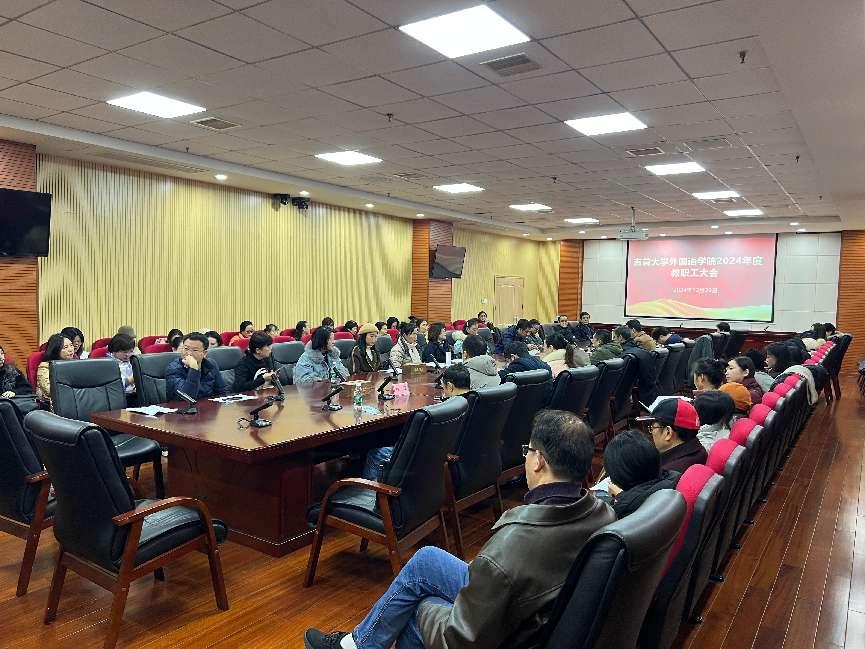 随后,公司党委书记、分工会主席简功友同志作了2024年度工作报告。报告全面回顾了过去一年学院在党建、人才培养、科学研究、团队队伍建设等方面取得的显著成果和宝贵经验。一年来,学院抓党建、强基础,不断提升政治生态;引人才、强内涵,着力提高办学水平;塑品牌、抓关键,全面落实立德树人根本任务。同时,报告也深入剖析了学院当前存在的问题,如顶层设计和制度体系尚待优化完善,人才队伍还不能完全适应学院发展的需要,学院文化建设还需进一步加强。对于今后一年的工作,简功友同志提出了明确的发展思路:建构一种自信;启动两大设计;明确三大任务,即聚焦专业提质改造、聚焦大学外语教学提质改造、聚焦学院文化提质改造;推进四项融合,包括推进跨校区融合、推进专外和大外融合、推进学科专业融合、推进校内校外融合。